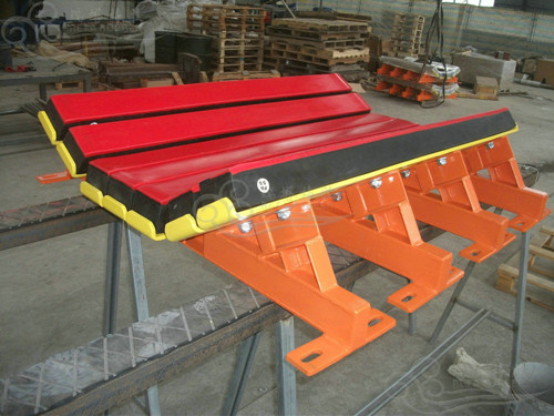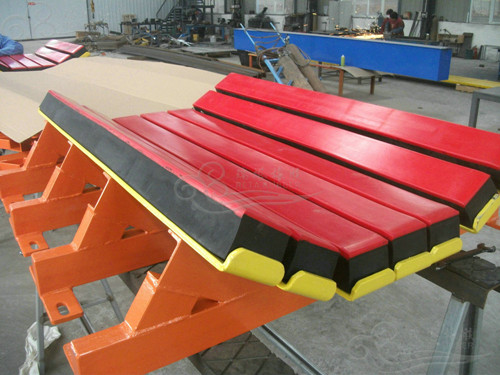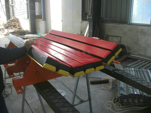 瑞塔橡膠為湖南婁底煤礦客戶提供的帶寬1000mm 4臺特殊緩沖床設計與生產,由于其客戶落料高度較低,但煤礦顆粒直徑較大因此采用5根橫梁支撐有效滿足抗沖擊力使用需求。